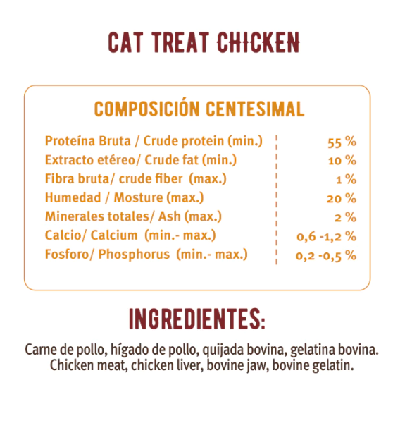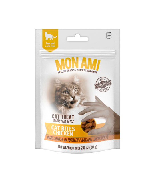 Mon Ami Cat Treat es un snack natural y saludable para gatos de todas las edades. Elaborado con ingredientes cárnicos de alta calidad, sin cereales ni subproductos, y con fórmula clean label. Rico en proteínas animales y colágeno natural, ideal como premio o refuerzo positivo. Contiene carne fresca como primer ingrediente y un 55% de proteína, respetando la naturaleza carnívora del gato.